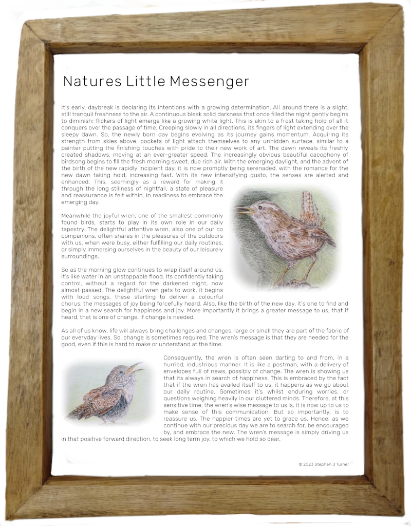 As all of us know, life will always bring challenges and changes, large or small they are part of the fabric of our everyday lives. So, change is sometimes required. The wren’s message is that they are needed for the good, even if this is hard to make or understand at the time.